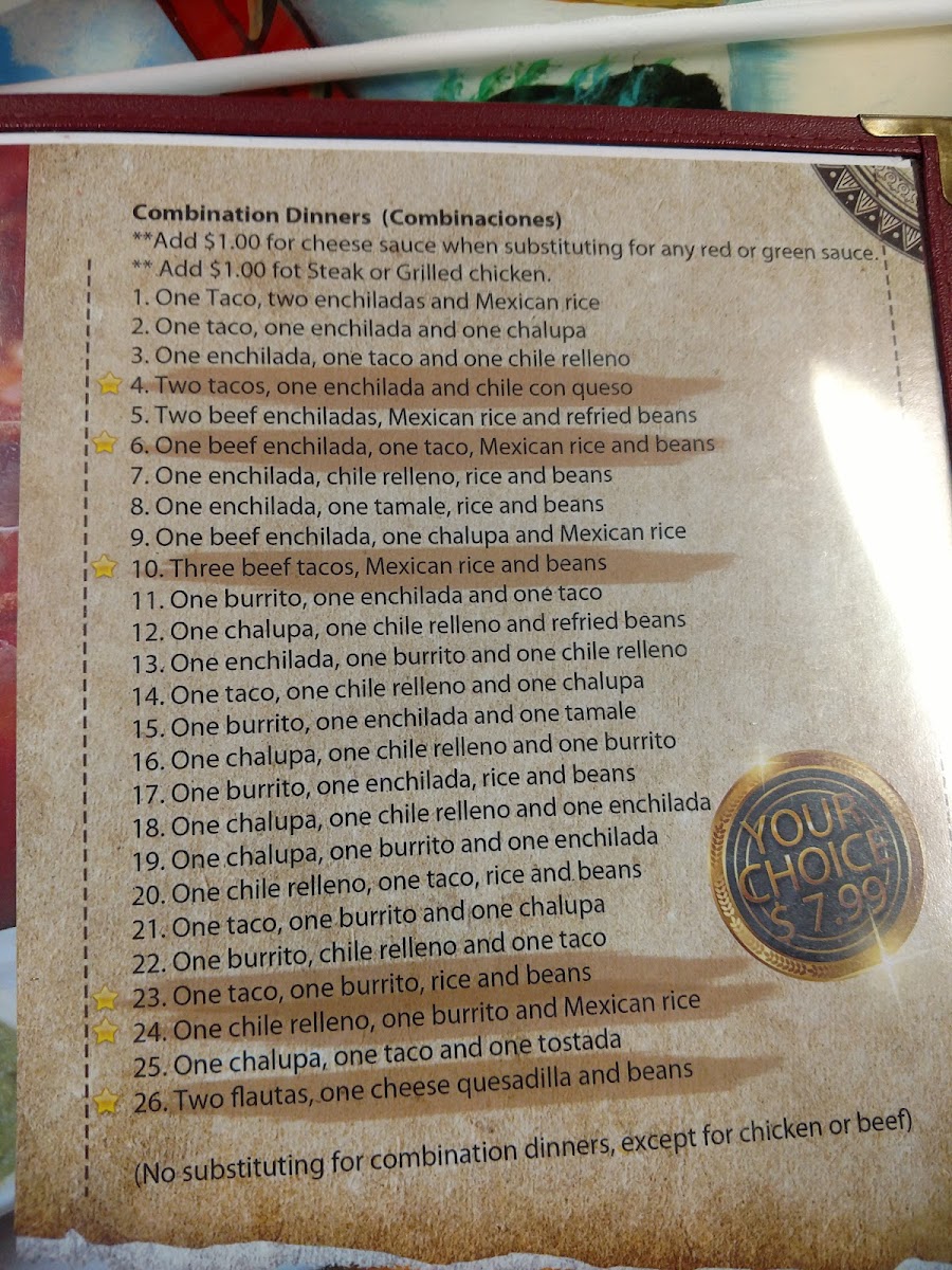One flauta, on enchilada, one burrito, one tamale, one chile relleno and one taco. Served with rice and beans.